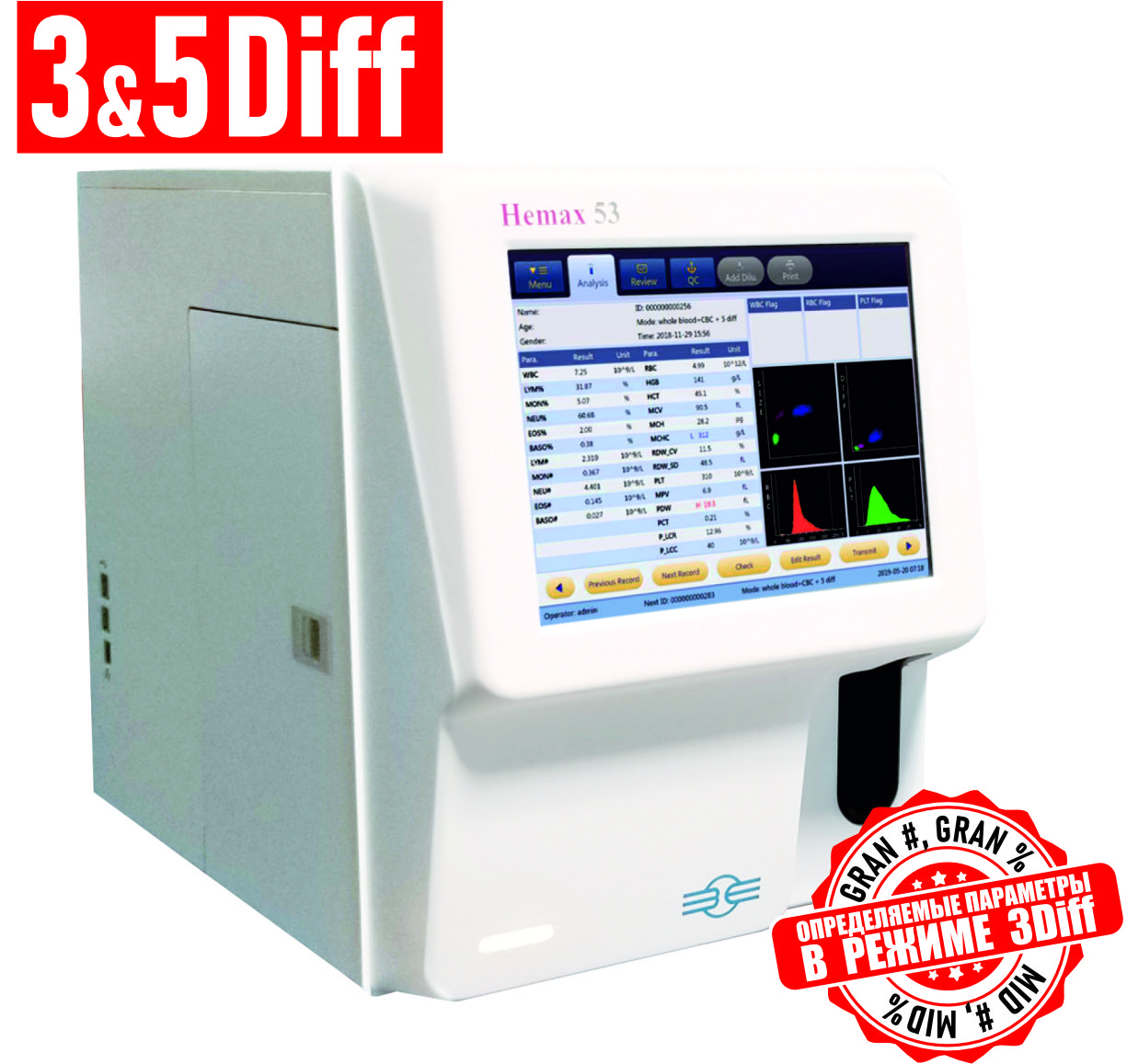 Комбинированный Анализатор автоматический гематологический Hemax 53 — это первая 5-diff система, работающая на реагентах с RFID-метками и контролях отечественного производства , имеет уникальные технические характеристики, возможность работы в 5DIFF (29 параметров) и 3DIFF (21 параметр) и компактный размер. Анализатор Hemax 53 отображает дифференциацию лейкоцитов по пяти и по трем популяциям, включая построение двух гистограмм и двух скаттерограмм. Анализатор работает с любыми типами гематологических пробирок в режиме «открытая пробирка».