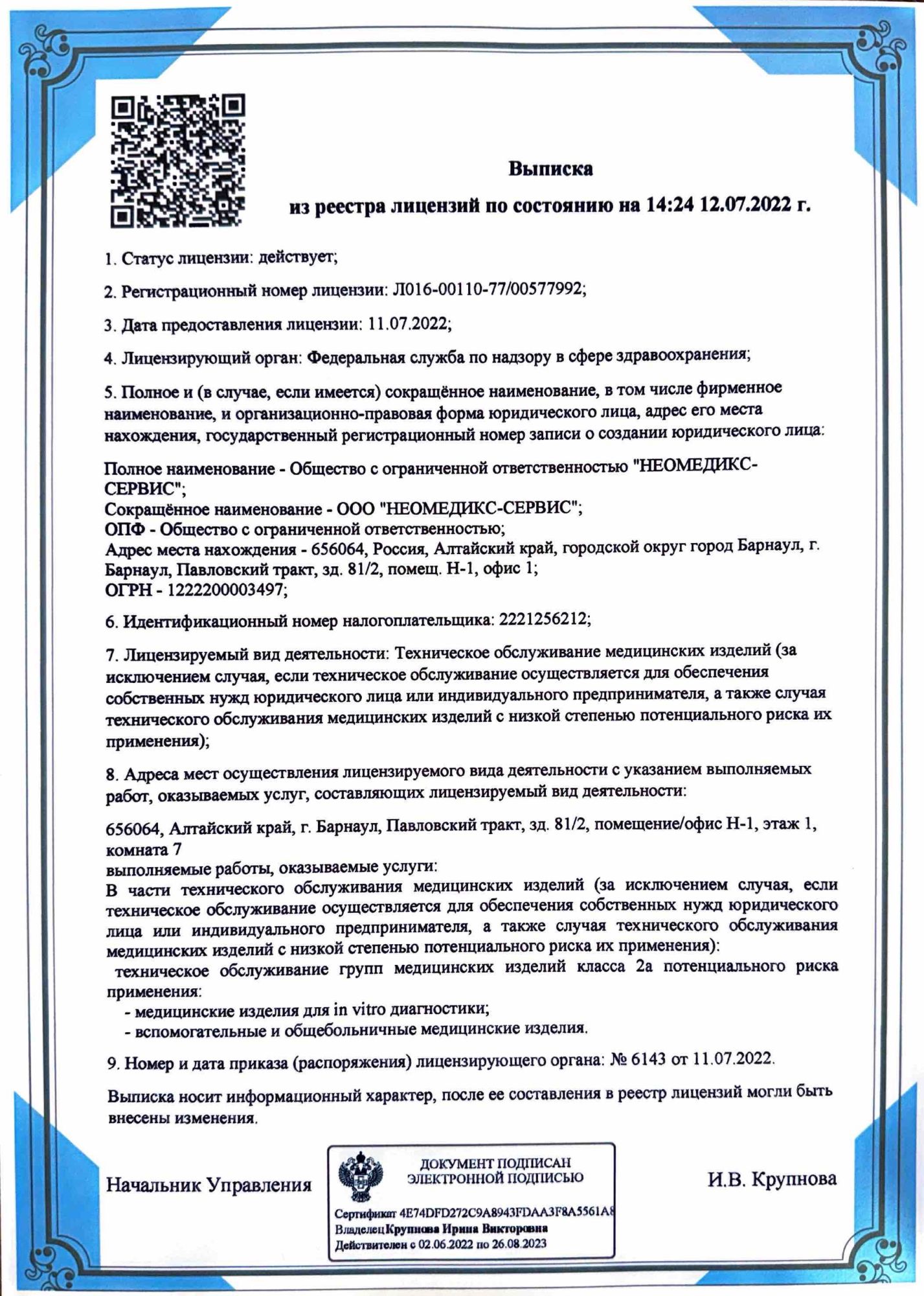 В августе 2025 года было получено регистрационное удостоверение на портативную экспресс-систему для количественноо измерения газов крови, электролитов, гематокрита, метаболитов "НЕОМЕДИКС 22" для диагностики in vitro по ТУ 26.51.53.141-002-327939-30-2023, производства ООО "НЕОМЕДИКС" (РУ №РЗН 2025/26106 от 27.08.2025 г.)