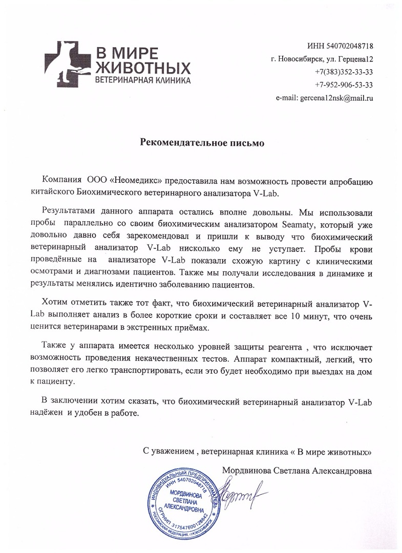 Компания ООО «Неомедикс» предоставила нам возможность провести апробацию киевского биохимического ветеринарного анализатора V-Lab. Результаты данного аппарата оказались вполне удовлетворительными. Мы использовали пробы параллельно со своим биохимическим анализатором Seamat, который уже давно доказал свою надежность. Анализы, проведенные на анализаторе V-Lab показали схожую картину с клиническими осмотрами и диагнозами пациентов. Хотим отметить тот факт, что биохимический ветеринарный анализатор V-Lab выполняет анализ в более короткие сроки и составляет все 10 минут, что очень ценно. Также у аппарата имеется несколько уровней защиты реагента, что исключает возможность проведения некачественных тестов. Аппарат компактный, легкий, что позволяет легко транспортировать, если это будет необходимо при выездах на дом к пациенту. В заключение хотим сказать, что биохимический ветеринарный анализатор V-Lab надежен и удобен в работе. С уважением, ветеринарная клиника «В мире животных» Мордвинова Светлана Александровна